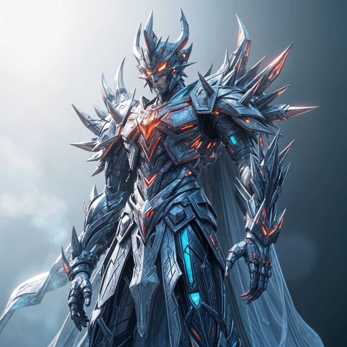 This image depicts a towering space god warrior with a gleaming metallic exoskeleton, intricate circuitry patterns, and razor-sharp spikes, clad in a flowing cape with an ethereal glow, rendered in stunning 3D anime art style with vibrant colors and ultrafine details.