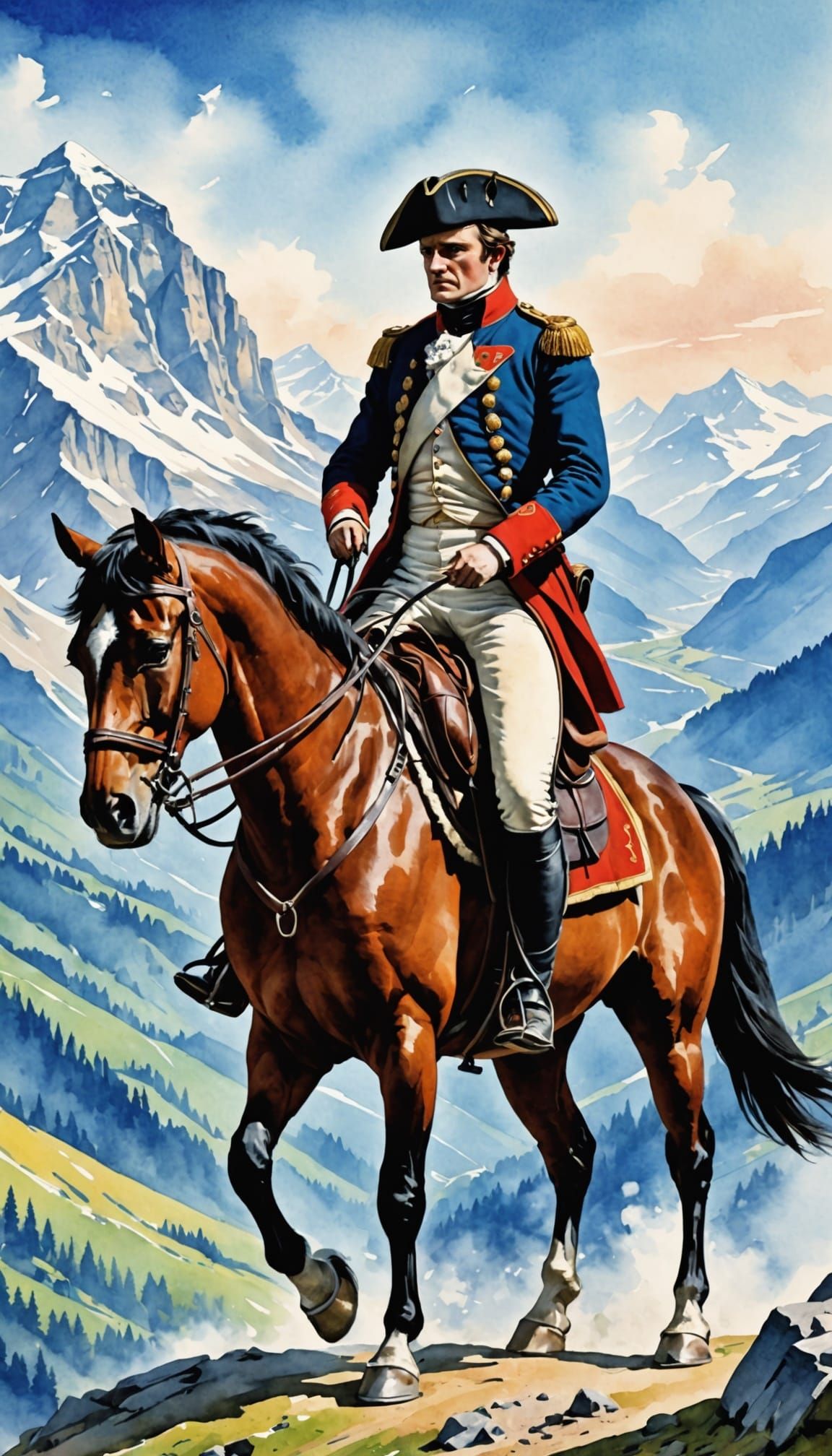 This image depicts Napoleon Bonaparte on horseback during his famous crossing of the Alps, rendered in a vibrant watercolor style.