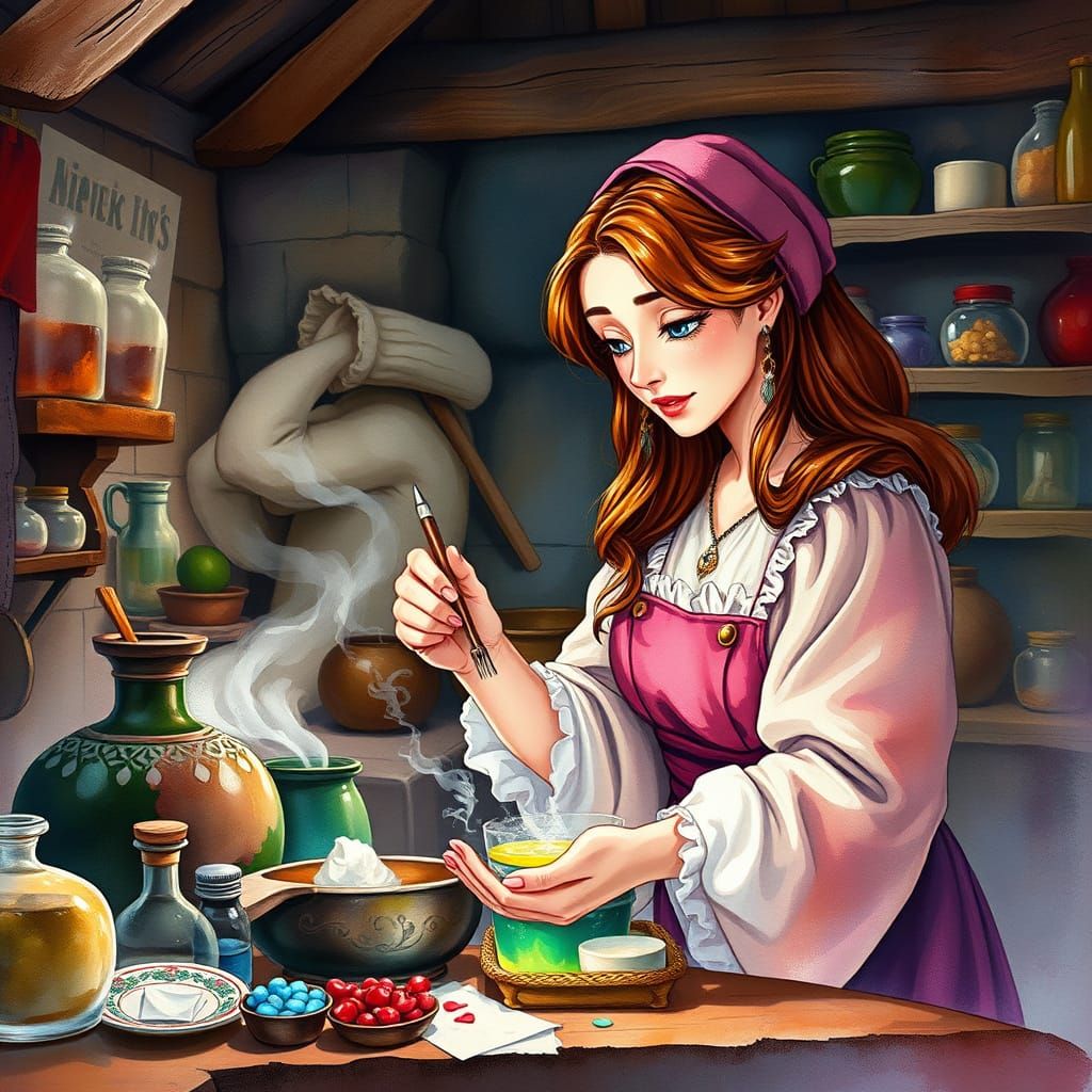 This image shows a middle-aged woman in a medieval kitchen, brewing a love potion. The artwork is rendered in light watercolors with an anime style and a cel-shaded, deep color palette.