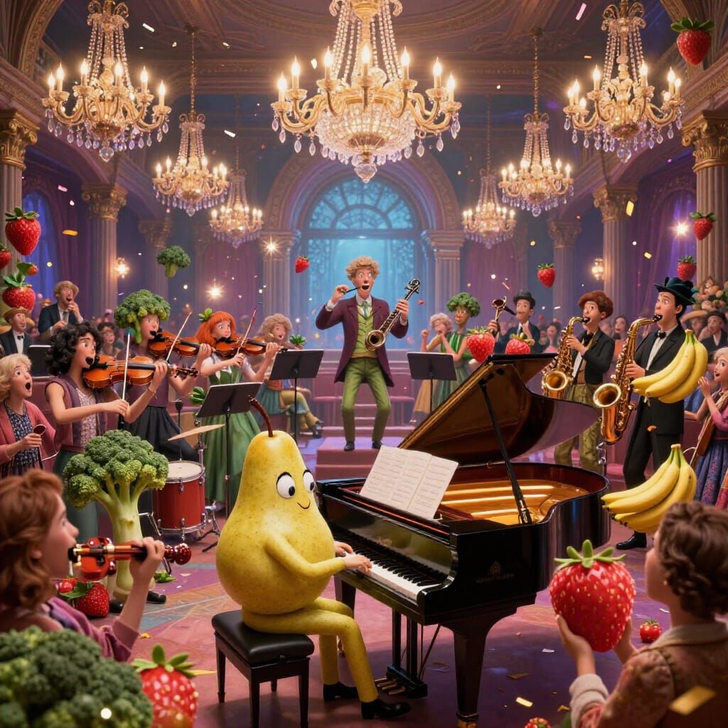 This image depicts a whimsical event hall where anthropomorphic fruits and vegetables perform as an orchestra, featuring a pear pianist and strawberry violinists, bathed in cinematic lighting.