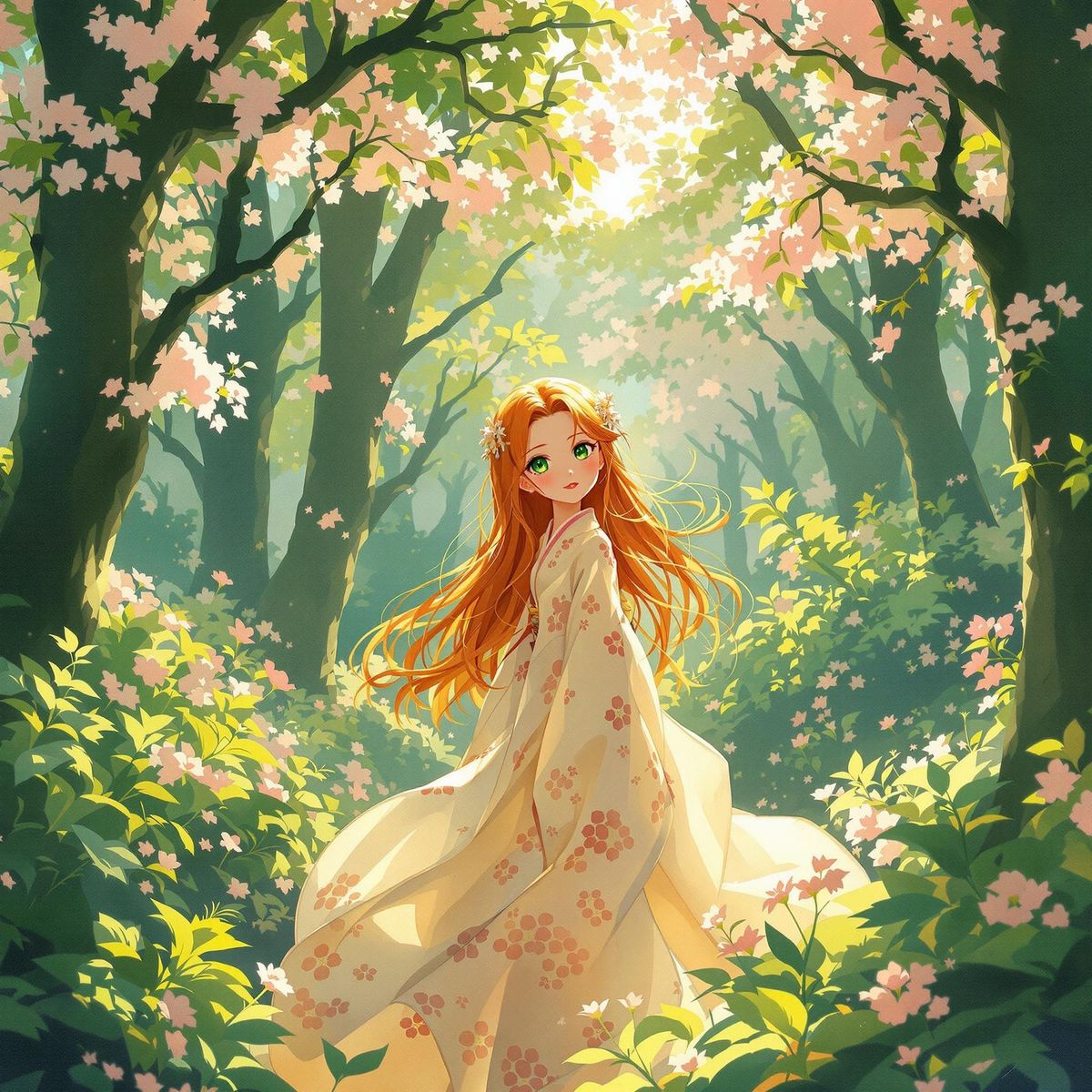 A striking picture of a girl with fiery orange hair in a cherry blossom kimono, standing in a lush forest. The image evokes a sense of wonder, reminiscent of anime concept art.