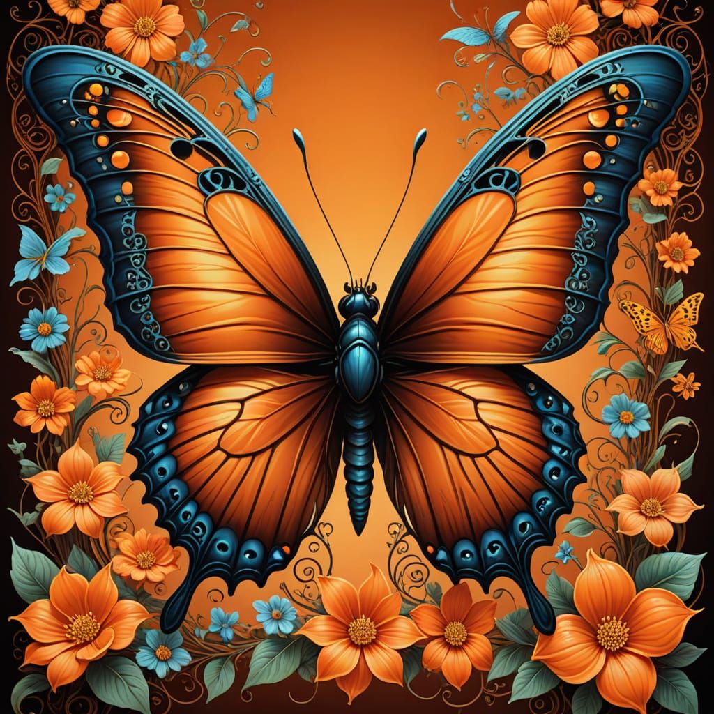 A striking picture of a carved butterfly with floral and lace details, rendered as digital filigree illustration. The butterfly features glowing neon tones and intricate patterns, with vibrant orange hues in the background.