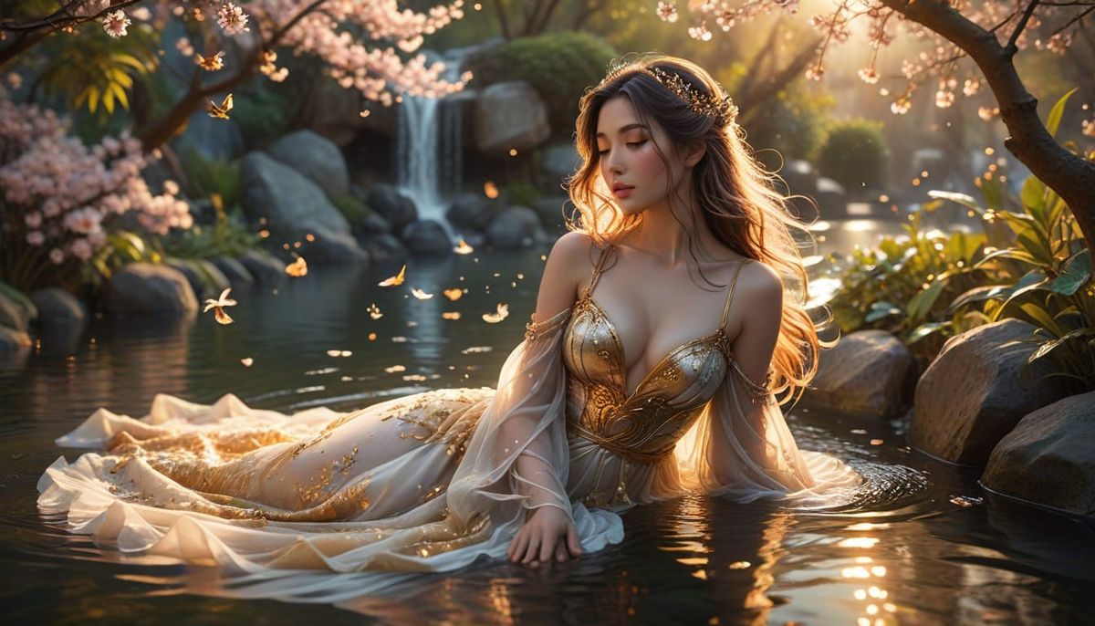 This image shows a beautiful woman with long hair sitting by a koi pond. Cherry blossoms fall gently around her in this dreamy, surreal fantasy scene with soft lighting. The artwork has a Japanese watercolor aesthetic.