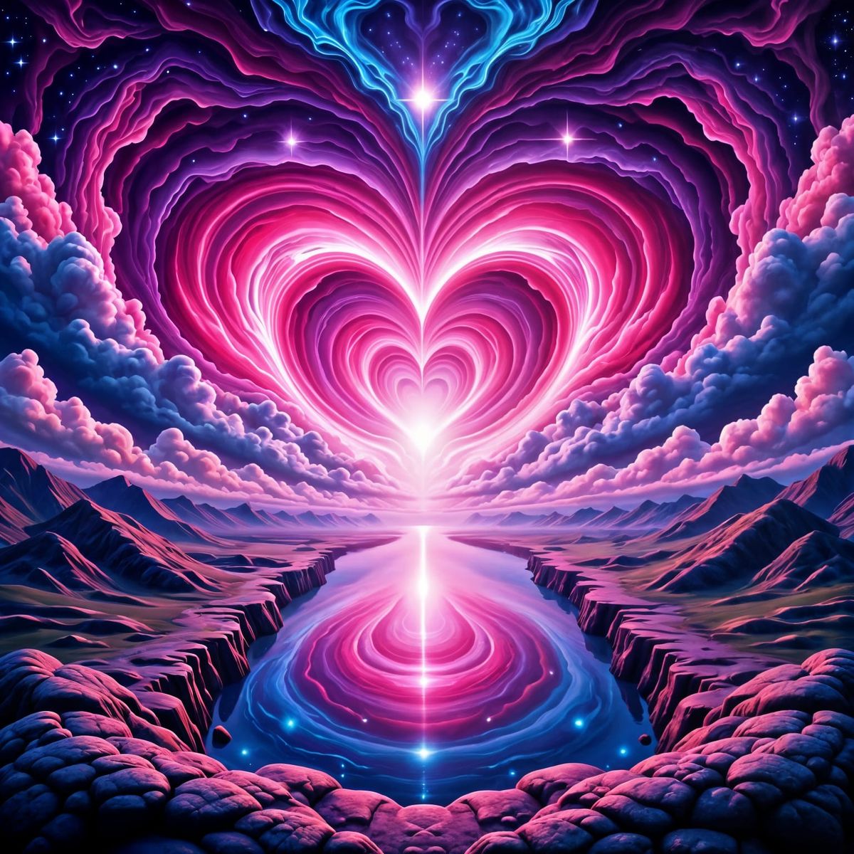 This AI image features a symmetrical, psychedelic double exposure of a serene landscape blended with vibrant pink stars. Swirling cosmic patterns create a dreamy, hypnotic effect in vivid pinks, purples, and blues, evoking peace and wonder.