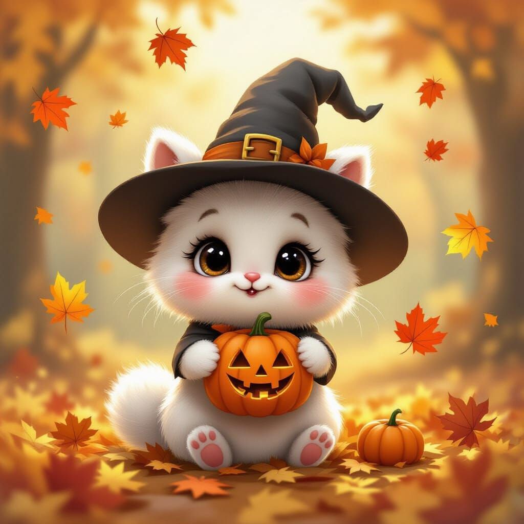 A charming illustration of an adorable, fluffy Halloween creature wearing a witch hat and holding a pumpkin, surrounded by autumn leaves. Features soft lighting and a gentle, storybook art style.