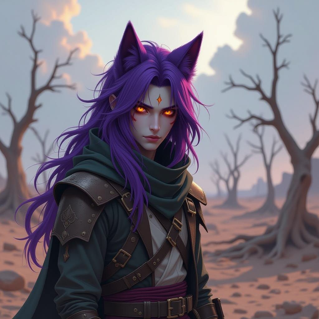 This image shows a male Kitsune psychic with purple hair and amber eyes in an adventurer outfit, standing in a dead wasteland. Rendered in a neo-surrealist digital art style with dramatic lighting and a melancholic palette.