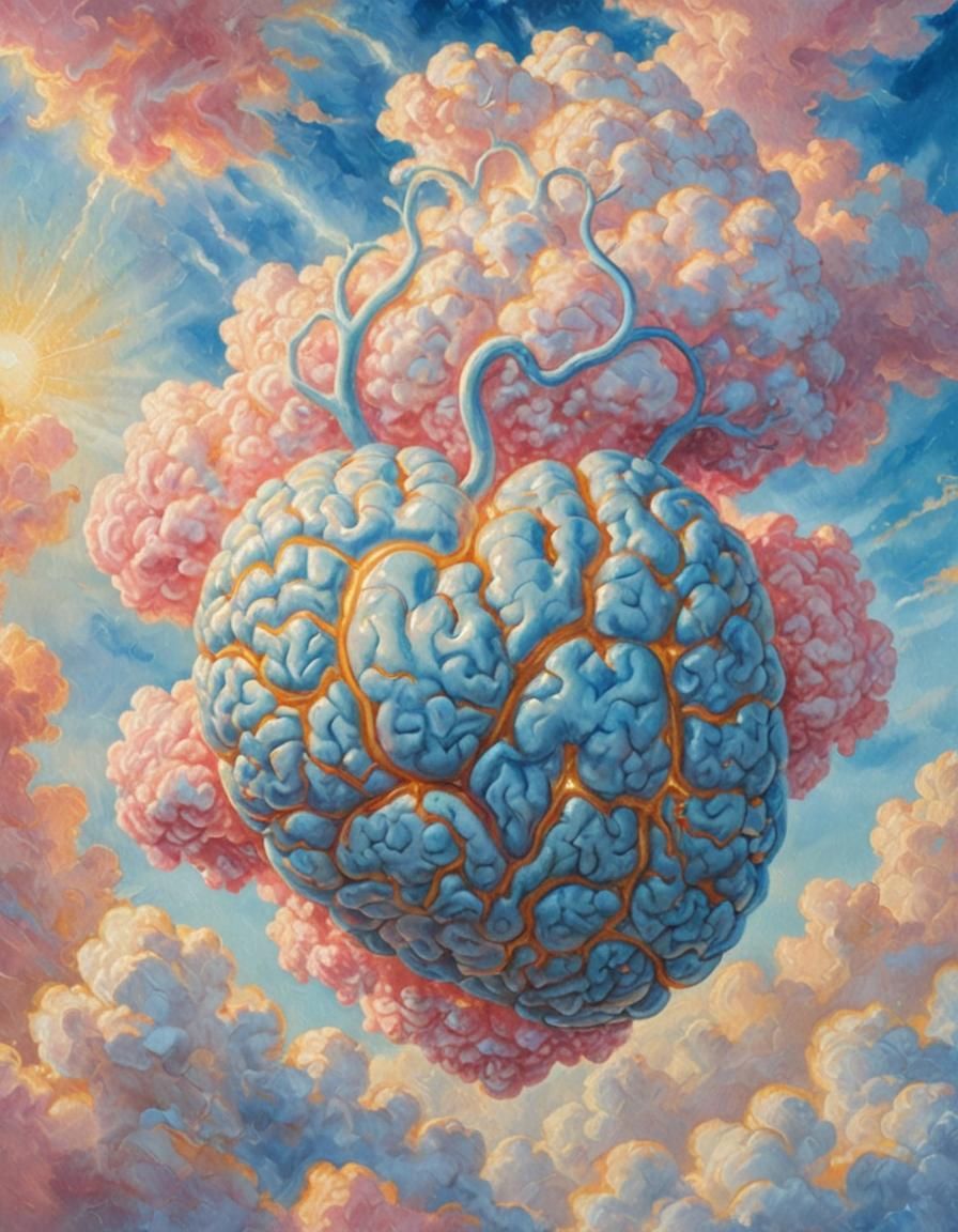 A surreal close-up of a brain with a heart-shaped aorta floating in the clouds. The image is rendered in soft pastel hues with a heavenly light, in an ethereal oil painting style.