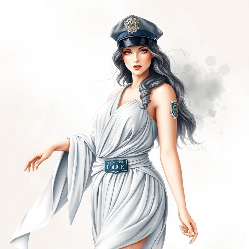 This image shows Aphrodite in a Grecian-style police uniform. The scene is rendered in soft, monochrome pastel watercolors with low contrast. Abstract fractal patterns and Zentangle details add complexity to the Botticelli-inspired style.
