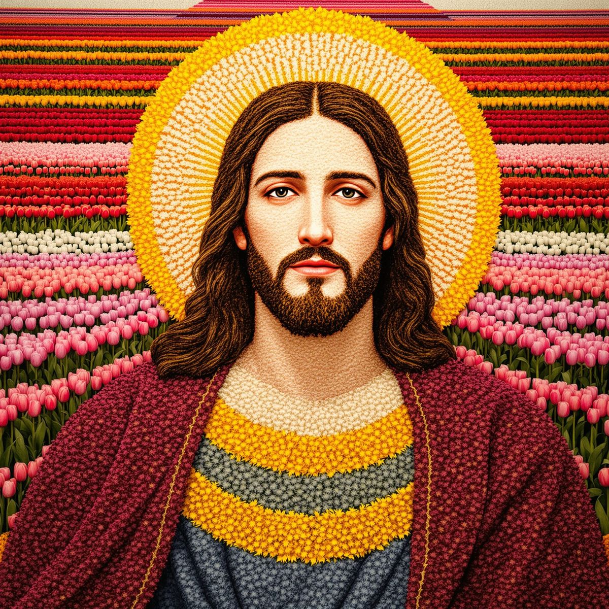 A devotional portrait of Jesus Christ rendered entirely from fresh flowers. The image features a serene face, golden halo, and a floral mosaic of tulips in the background.