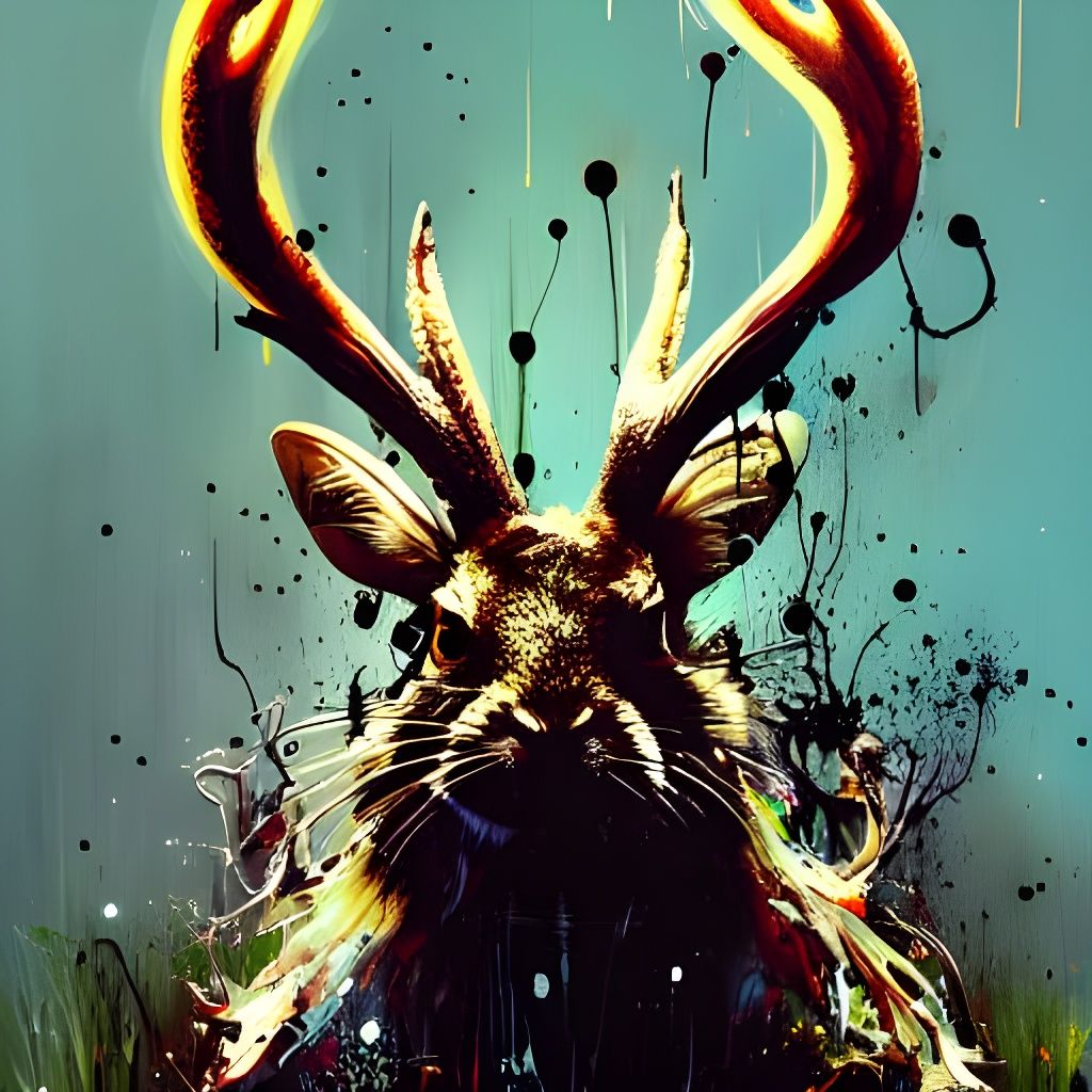 A striking picture of a creepy jackalope with glowing eyes. This speed painting, in a maximalist style, features paint splatters and drips for a highly detailed, intricate, and uncanny effect.