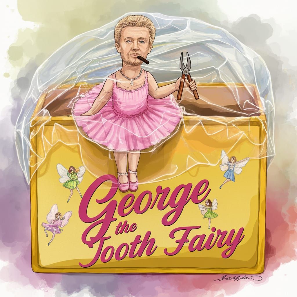 This vibrant illustration features a cellophane-wrapped toy box containing a charming figure in a pink tutu and slipper, with a male face and cigar, amidst a scene of fairies and soft pastel hues.