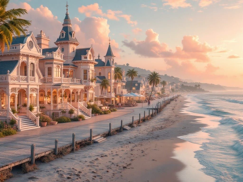 This idyllic image captures a quaint beachfront town in soft pastel colors, with intricately detailed architecture and a serene beach scene, evoking a sense of enchantment and tranquility, reminiscent of a dreamy, ethereal quality.
