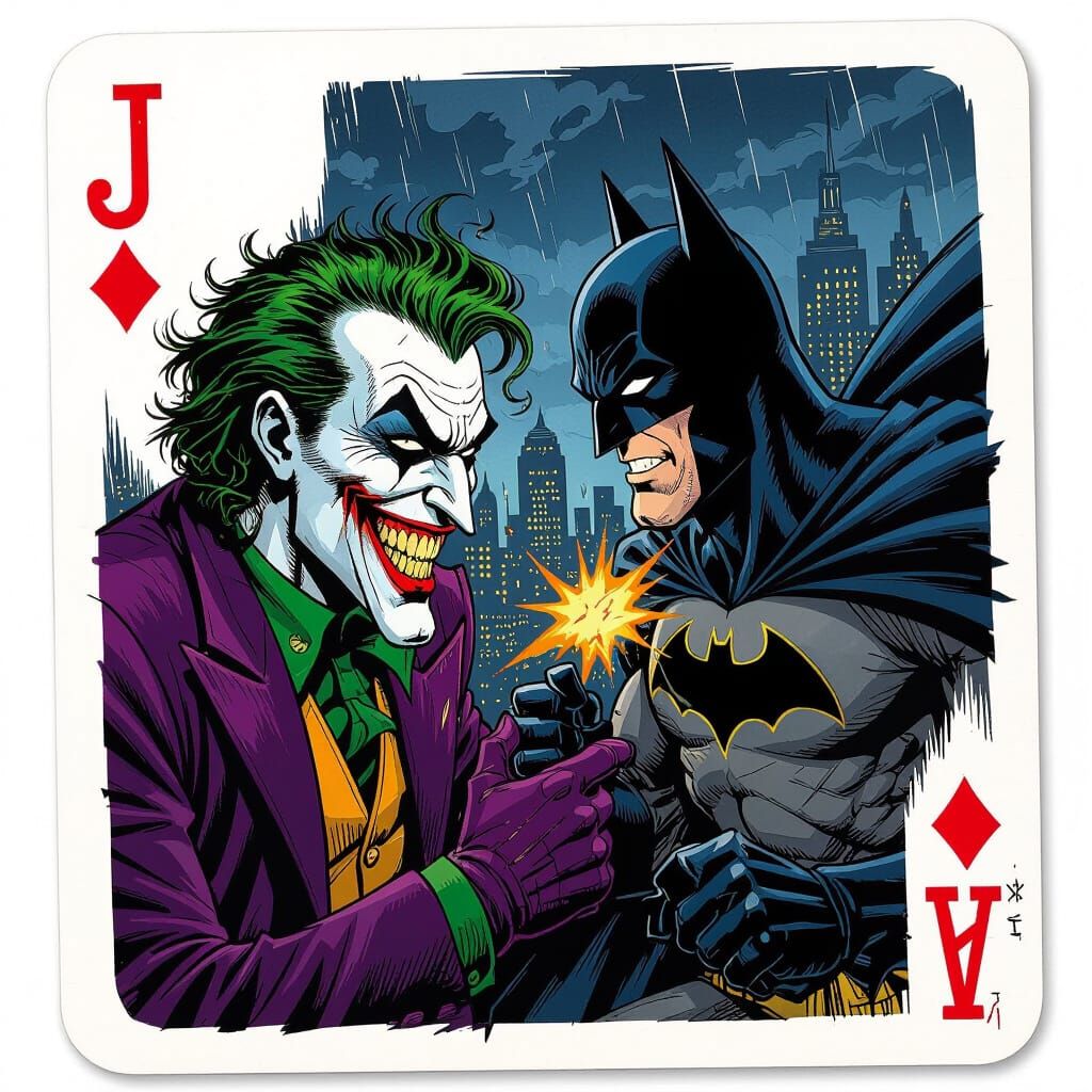 This image shows a dramatic playing card scene featuring the Joker battling Batman, rendered in a graphic novel style with high contrast and chiaroscuro lighting.