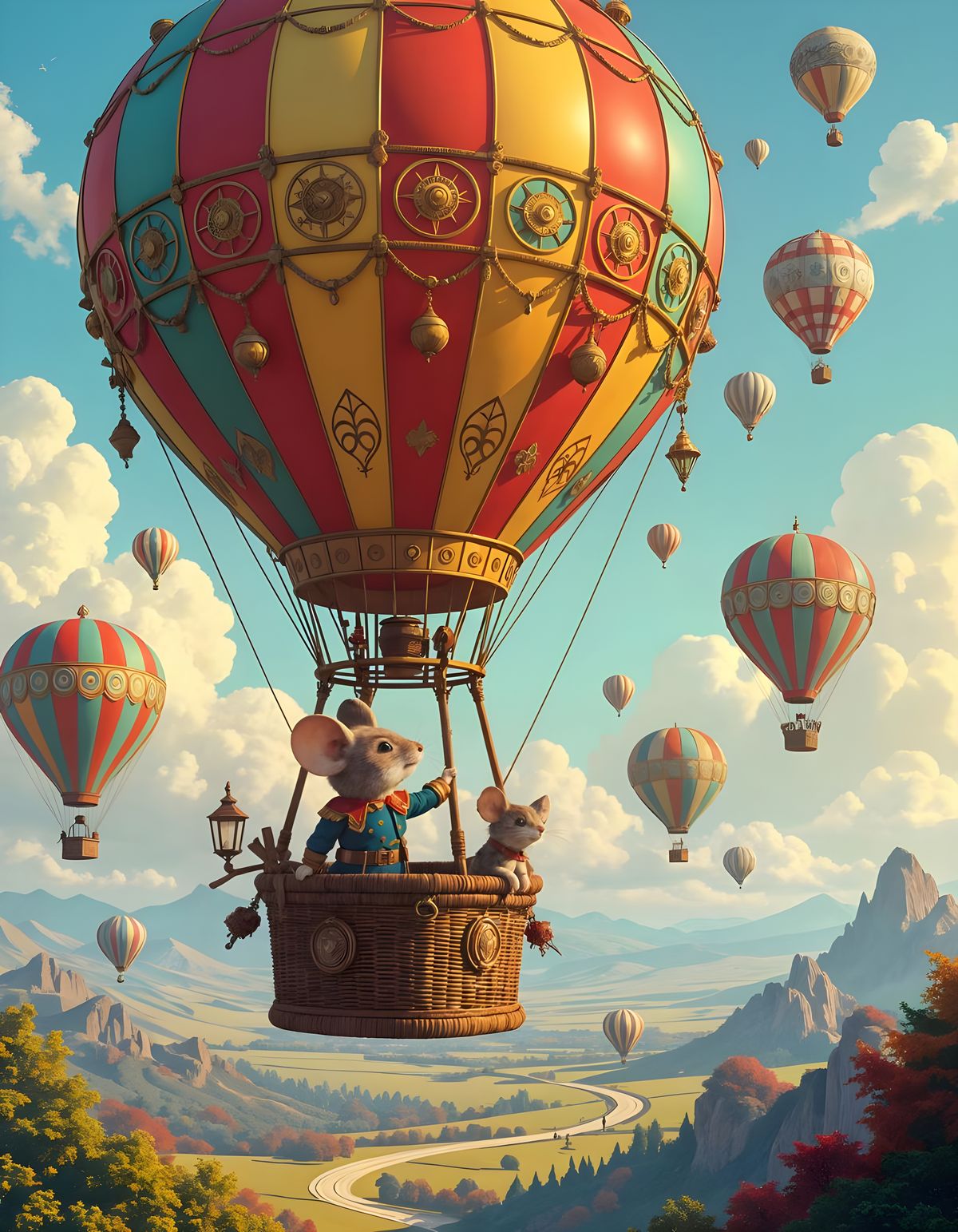 This image shows a cute mouse in a steampunk uniform in a hot air balloon, observing a fantasy landscape. The sky is filled with other colorful hot air balloons in a vivid, bold, 3D fantasy style.