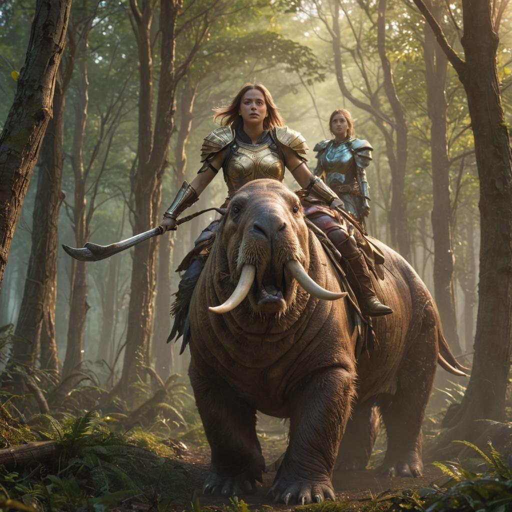 A striking picture of a woman in armor riding a walrus through a sunlit forest. The image is a highly detailed digital painting with a warm color palette and dramatic lighting.
