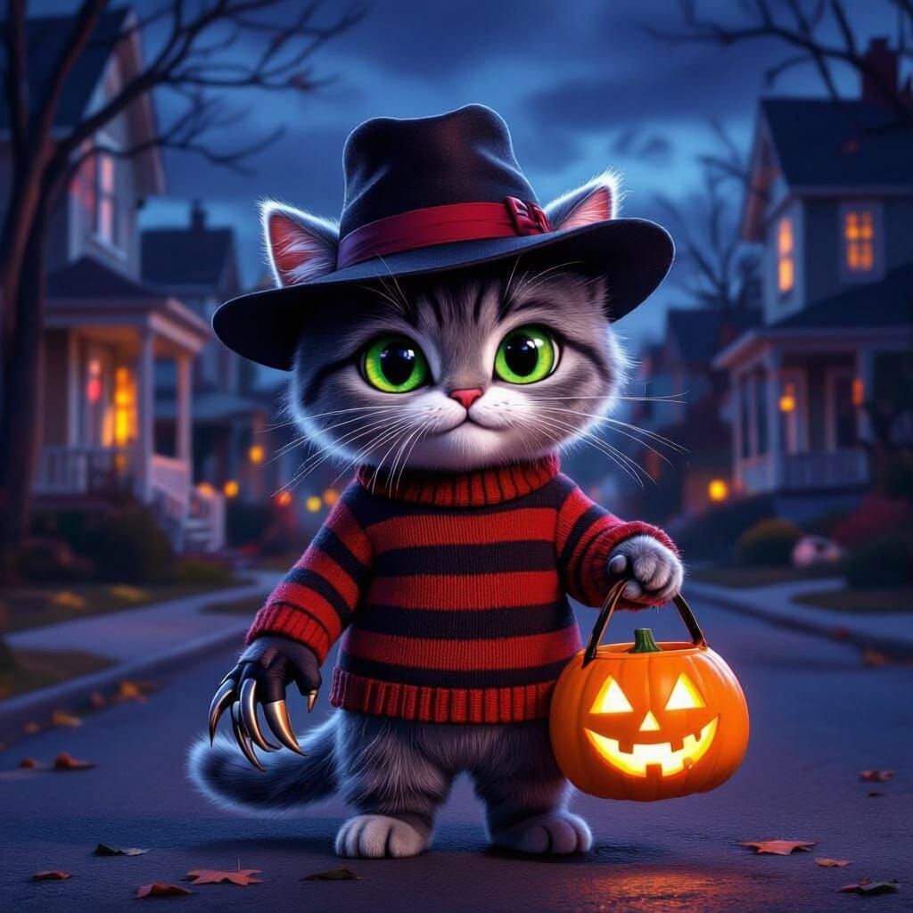 Generate unique images of cats in costumes, trick or treating, or with Freddy Krueger vibes. It's free and easy!