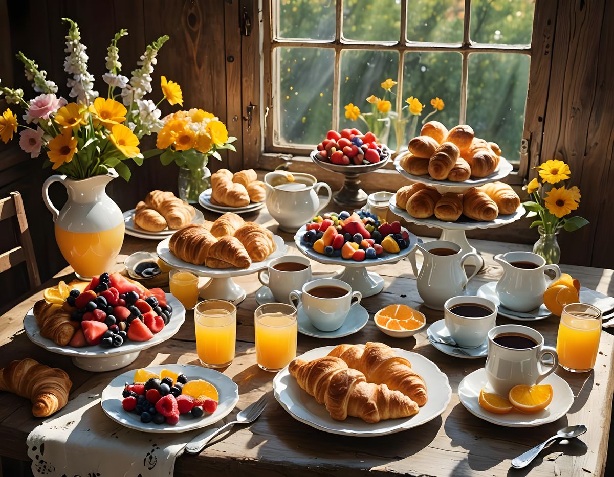 A bright image of a rustic breakfast scene with sunlight casting shadows on fresh fruit, croissants, pastries, preserves, orange juice and coffee. Floral accents add a touch of color.