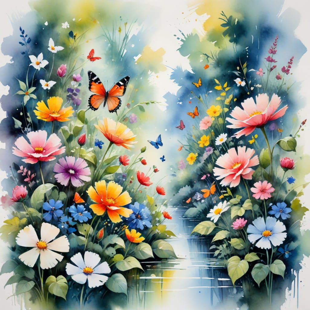 A vibrant watercolor painting of a magical garden. The scene is filled with colorful flowers and butterflies, rendered with delicate techniques and ethereal stylization, creating a mesmerizing artwork.