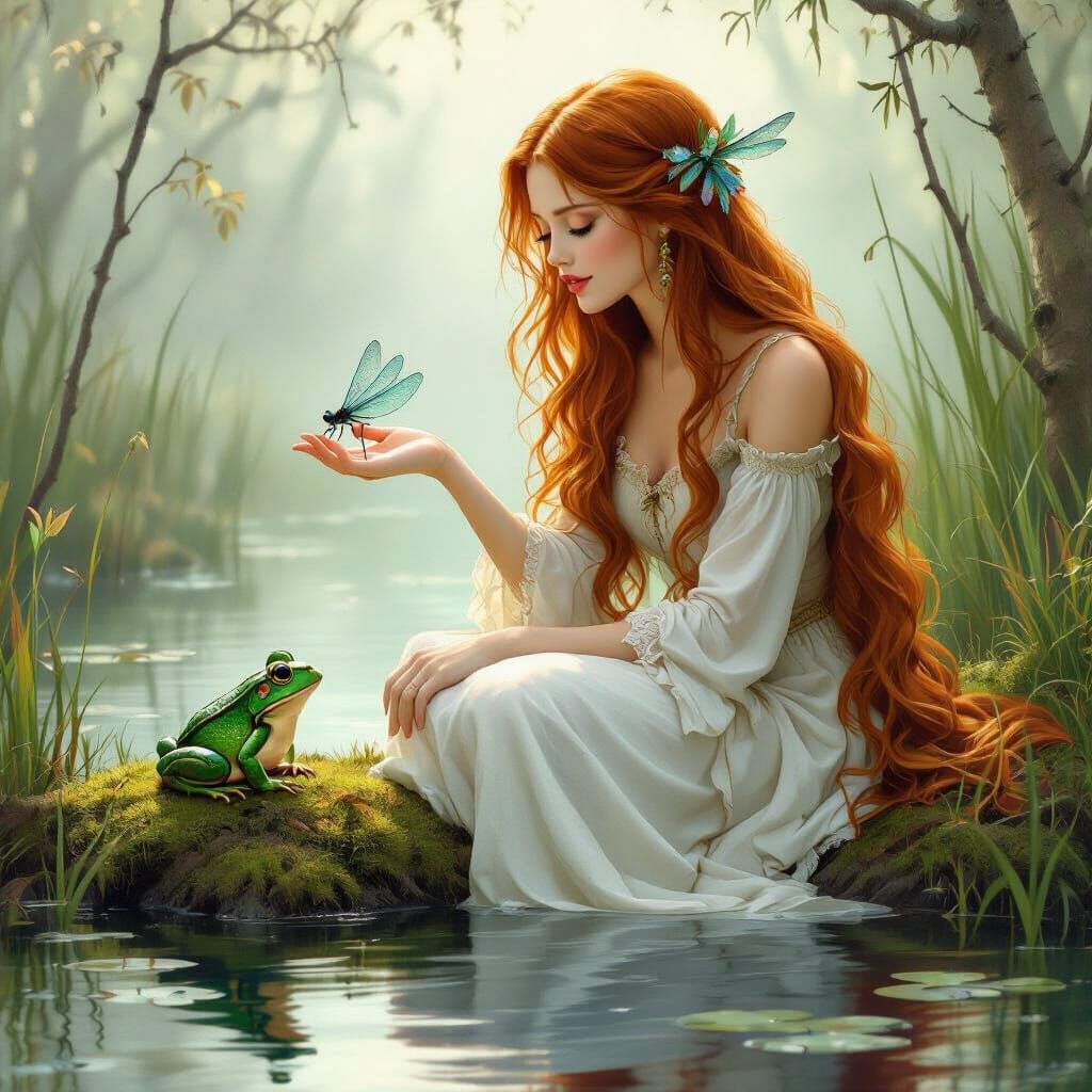 This image shows a woman with long auburn hair singing to a frog by a boggy pond, with a dragonfly on her shoulder. Rendered in a dreamlike fantasy illustration style with rich, saturated colors.