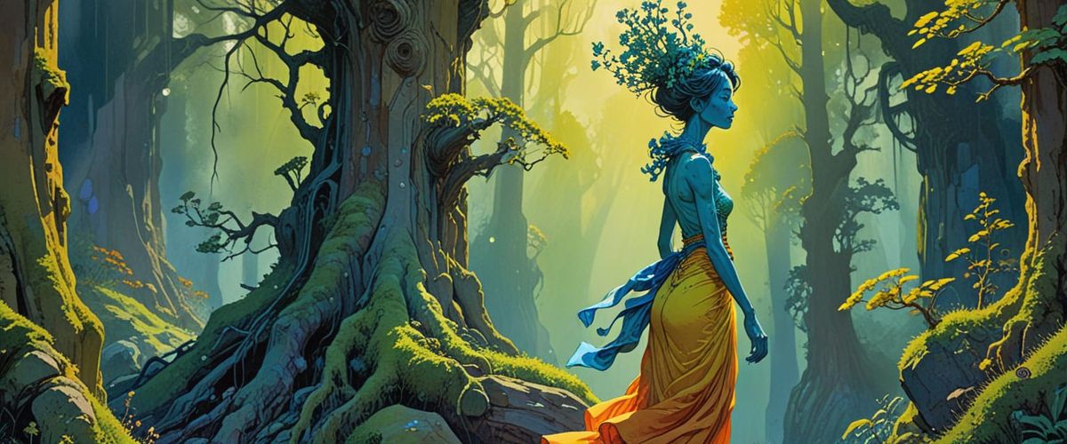 This image depicts a hoodoo root lady from a retro comic book style, lifting a curse. It features influences from Moebius and Ghibli, with mossy green and indigo blue contrasted by orange-yellow.