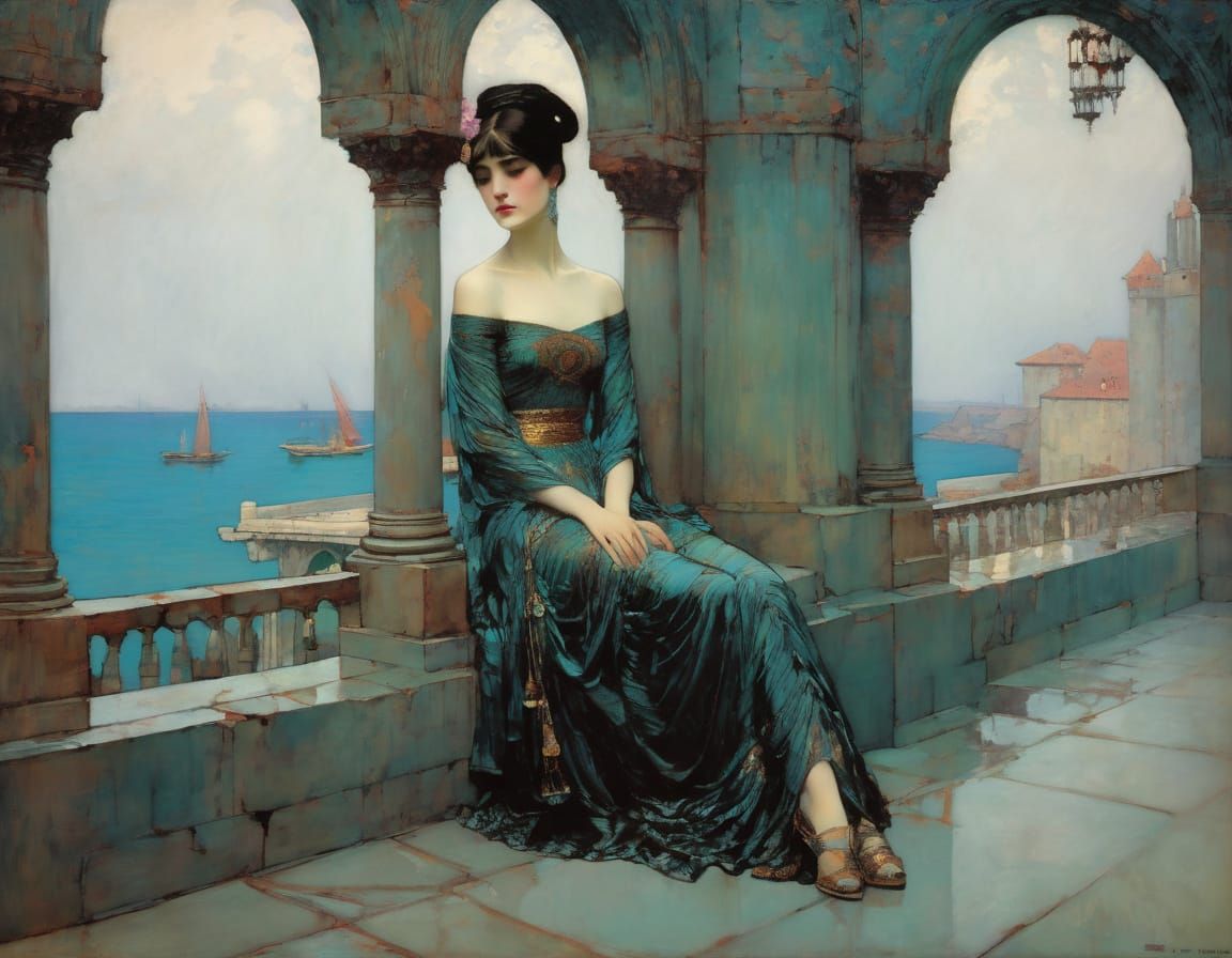 This image showcases a castle scene rendered as a soft oil painting, influenced by a blend of classical and contemporary artistic interpretations.
