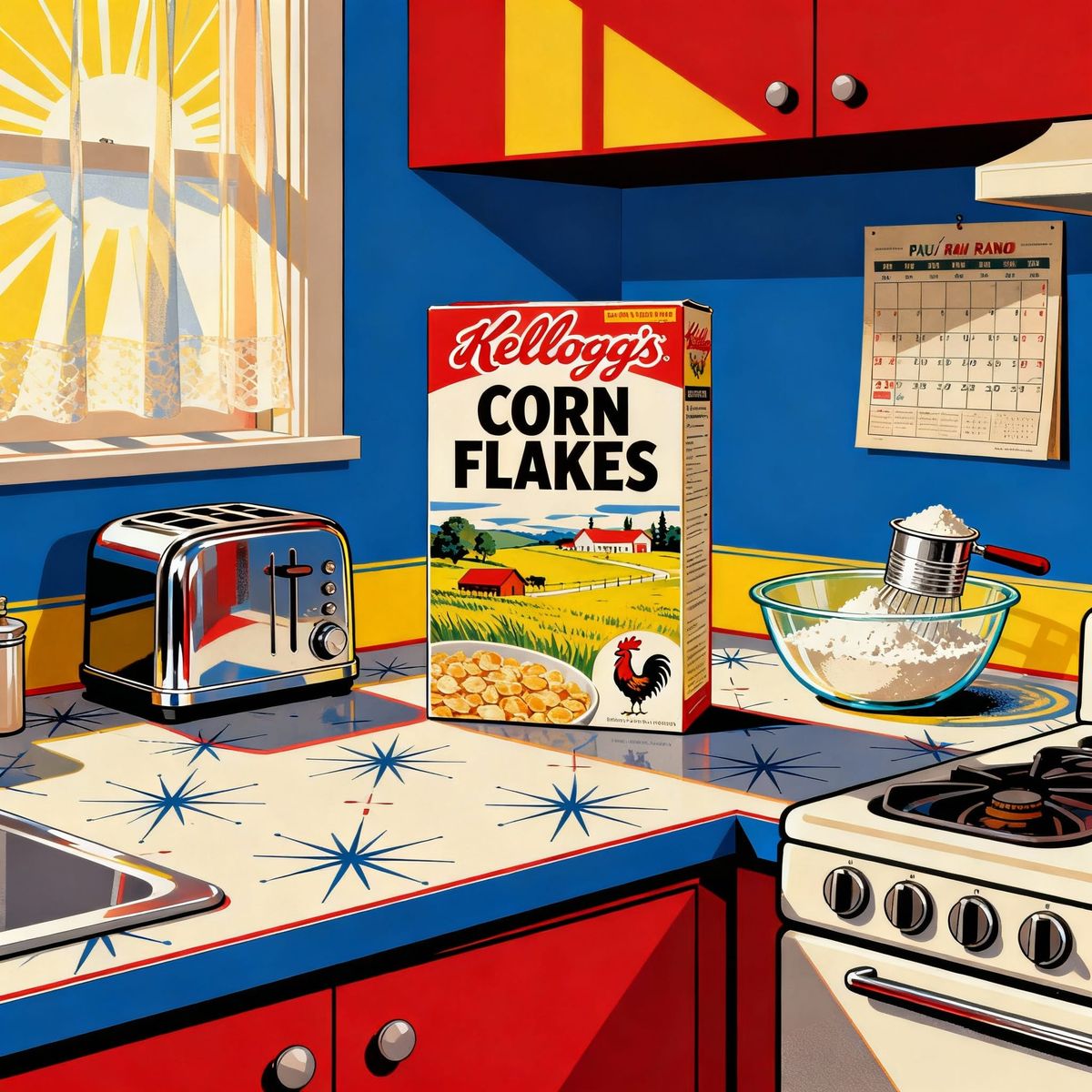 This image shows a Kellogg's Corn Flakes box on a 1960s kitchen counter, capturing a warm, nostalgic mood. Rendered with bold lines and vibrant triadic colors, it features geometric influences and balanced composition.