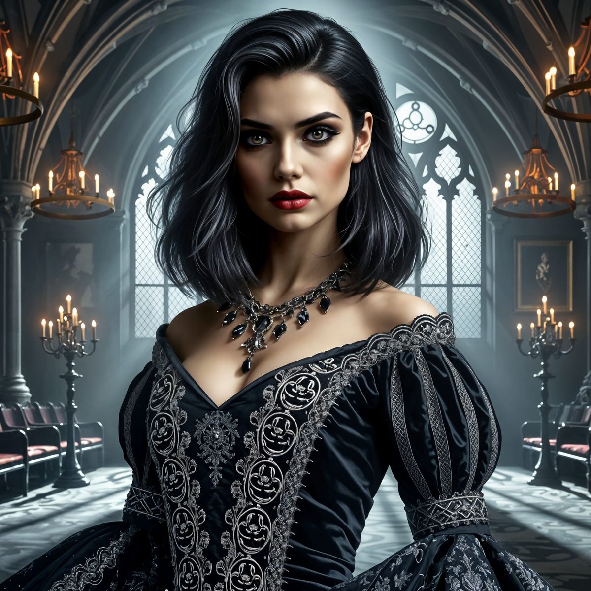 A portrait of a vampire matriarch in a neo-gothic hall, illuminated by candlelight and moonlight. She has porcelain skin, dark eyes, and wears a black velvet gown with silver embroidery. The portrait is a masterpiece of painterly realism.