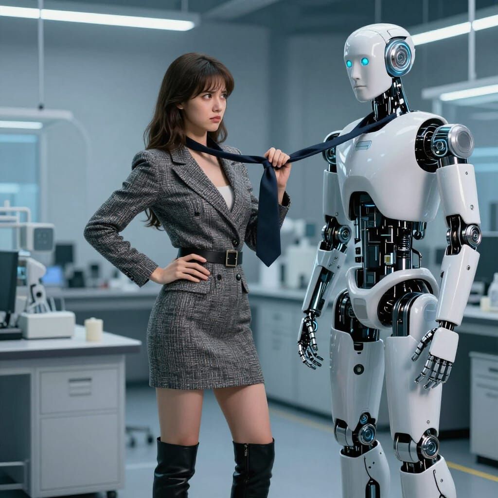 Photo-realistic. Gorgeous female android trying to get the attention of generic masculine robot. She dresses in chic dress & black boots. He has a neck tie that she is trying to tease him with, but he just is not programmed to respond. Background is a high tech laboratory. Use meticulous attention to ...