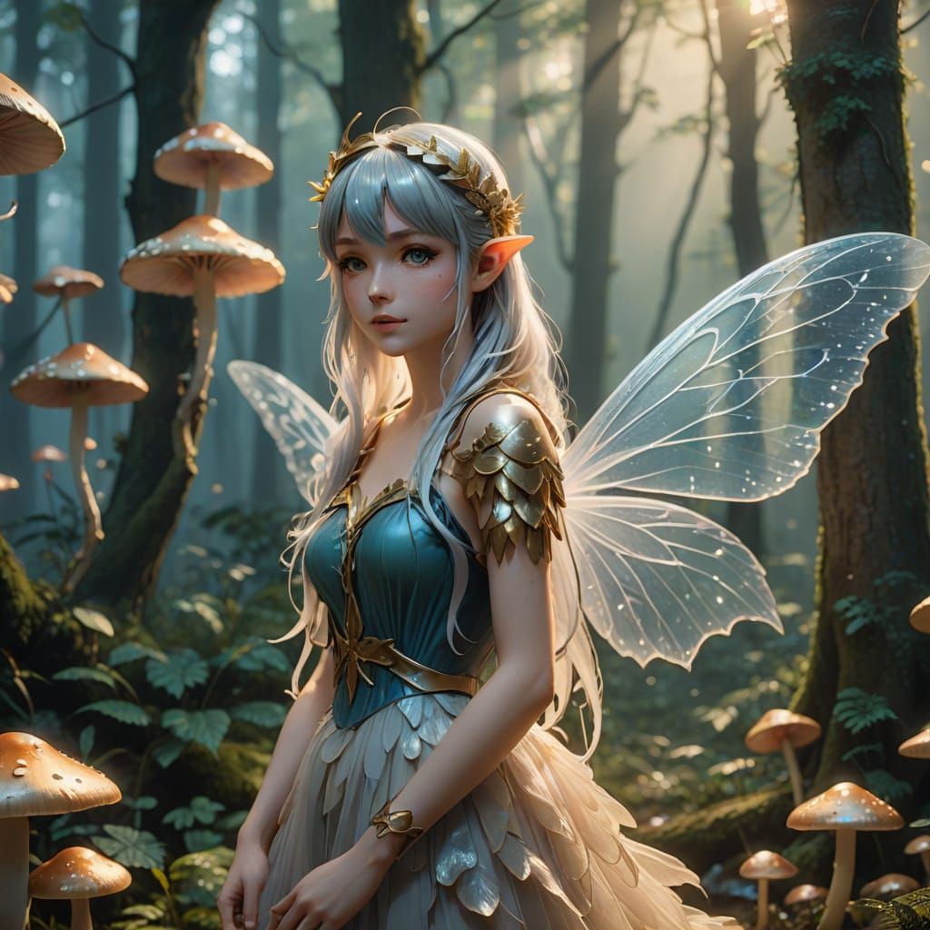 This image shows a fairy in a misty forest with glowing mushroom caps and shimmering wings. The artwork features soft pastel colors, warm golden light, and hyperdetailed elements as 3D anime art.