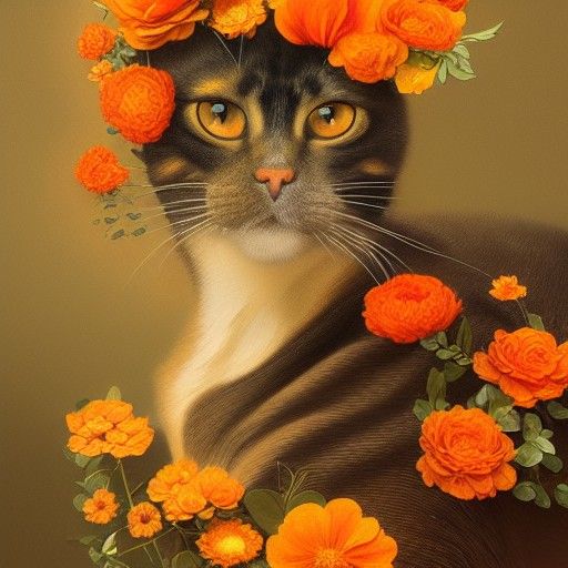 This image shows a tortoiseshell cat in a floral headpiece. The feline portrait features a shallow depth of field and golden bokeh, rendered as detailed digital art with dynamic lighting.