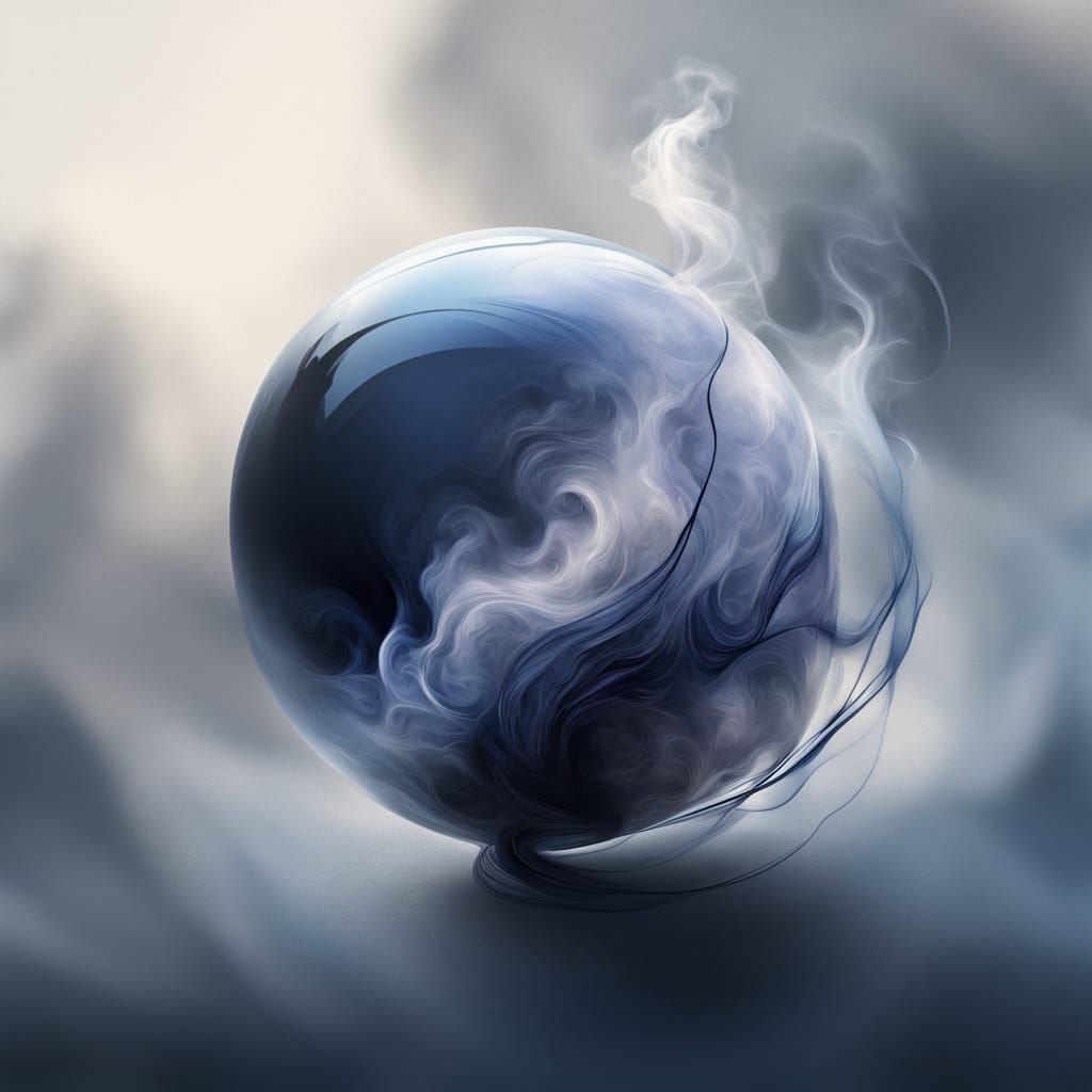 This image shows an abstract representation of longing, featuring smoke tendrils around a fragile glass orb in a void. It uses muted indigo and charcoal colors in a surreal, abstract expressionist style.