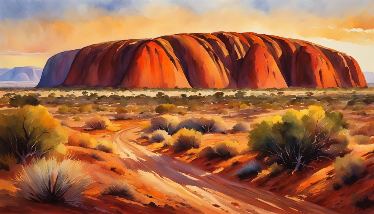 This image shows a medium shot of Ayers Rock in the Australian desert. A vibrant watercolor landscape painting in warm sunlight using soft brushstrokes to capture a serene, majestic scene.