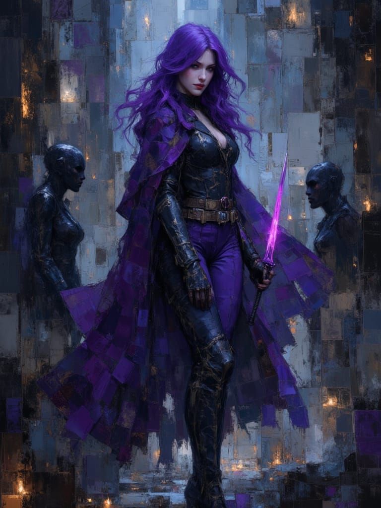 This image shows a female rogue with purple hair battling black demons in castle ruins. The scene is rendered in a detailed pen and ink style with dramatic shading, reminiscent of dark fantasy art.