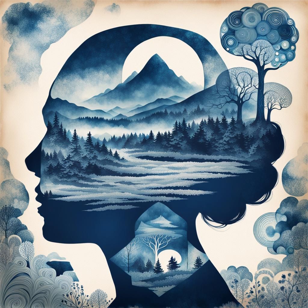 A surreal double exposure image of ethereal cyanotype landscapes. The artwork features ink techniques and zentangle patterns, creating a dreamy and warped aesthetic.