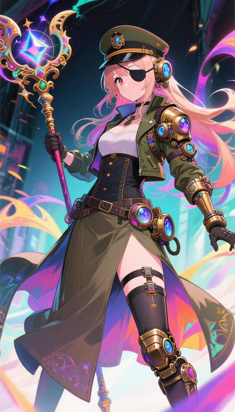 This image features a girl in a dieselpunk outfit with armor, a dress, and a military cap, holding a magical staff. It has vibrant colors and intricate details, reminiscent of anime key visuals.