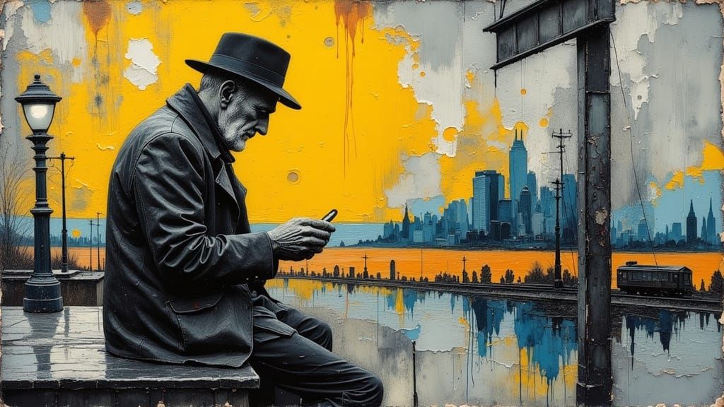 This image shows an elderly station master checking his pocket watch on an empty platform, rendered with textured impasto and swirling paint. The color palette is weathered grays, rust yellows, and distant blues.
