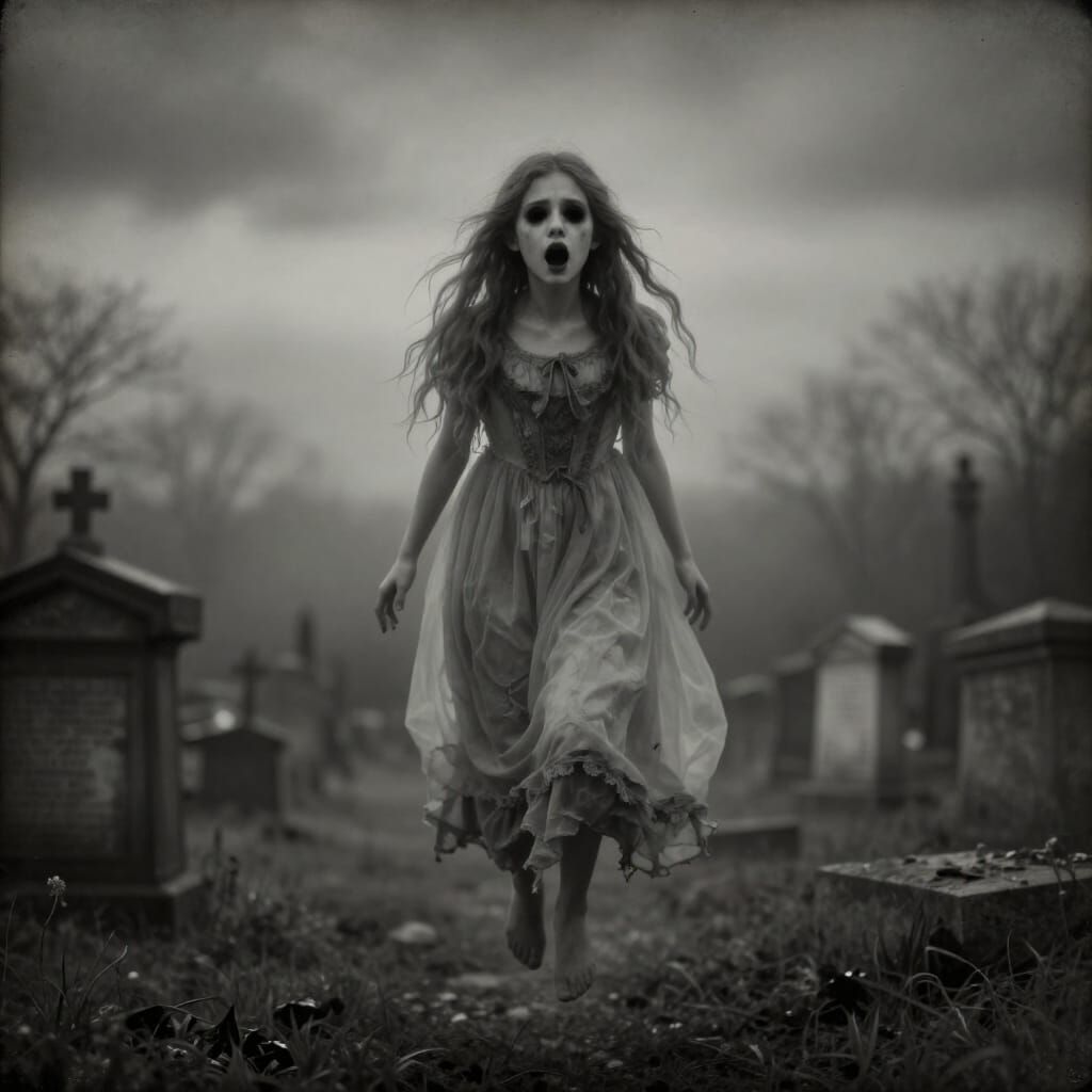 This image shows a translucent ghost teen girl in a tattered 1800s gown, floating in a foggy cemetery at dusk. Rendered with a degraded, desaturated daguerreotype aesthetic and dramatic lighting.