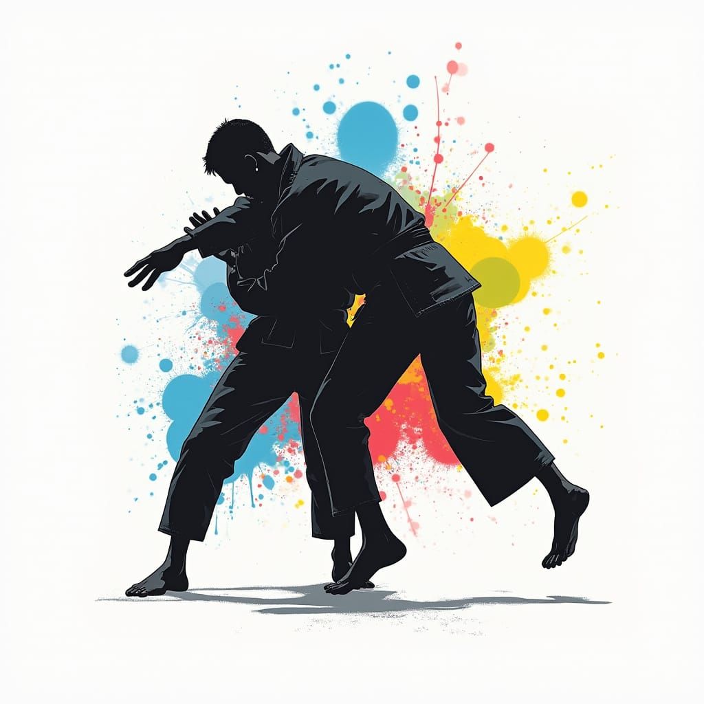 This image depicts a dynamic young judoka in mid-motion, executing a powerful shoulder throw with precision and strength, set against a vibrant and colorful background, blending elements of minimalist and pop art aesthetics.