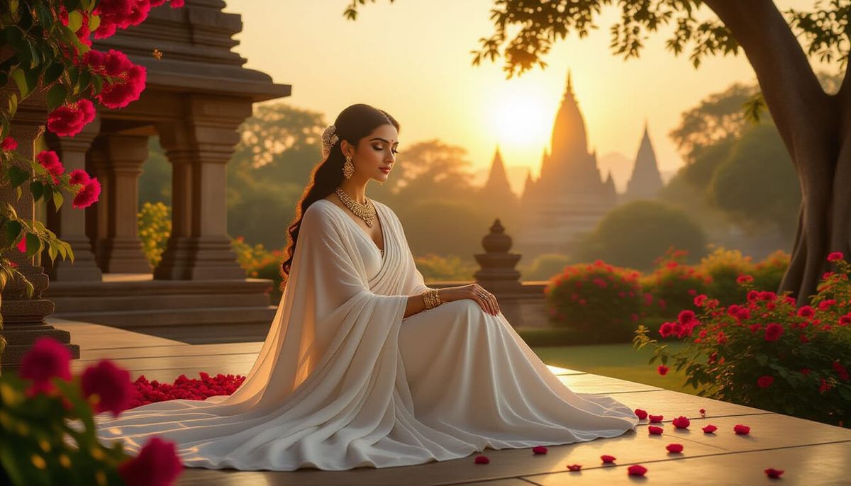 A striking picture of a beautiful South Asian royal woman in a palace garden at sunset. She is draped in white robes, with golden sunbeams and temple spires in the distance, as photorealistic digital art.