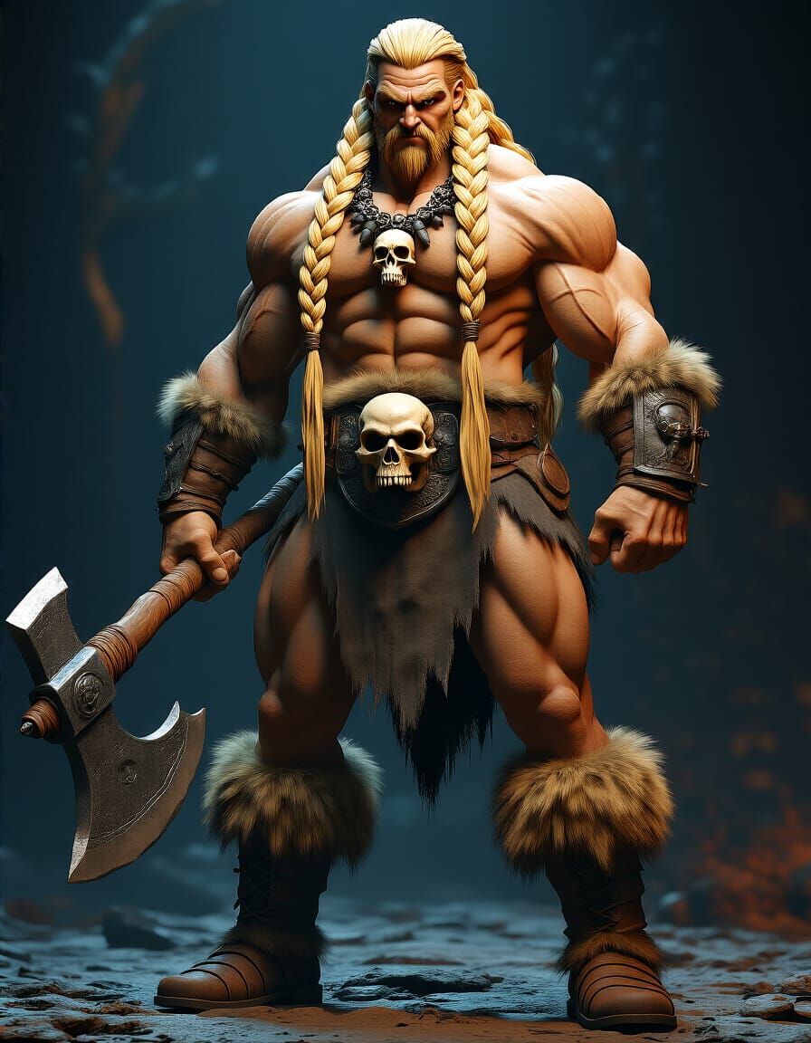 A highly detailed 3D render shows a powerful barbarian with blond braids, skull necklace, and fur boots. He wields a massive battle axe, presented with cinematic lighting and vivid, high-contrast colors for a dark fantasy feel.