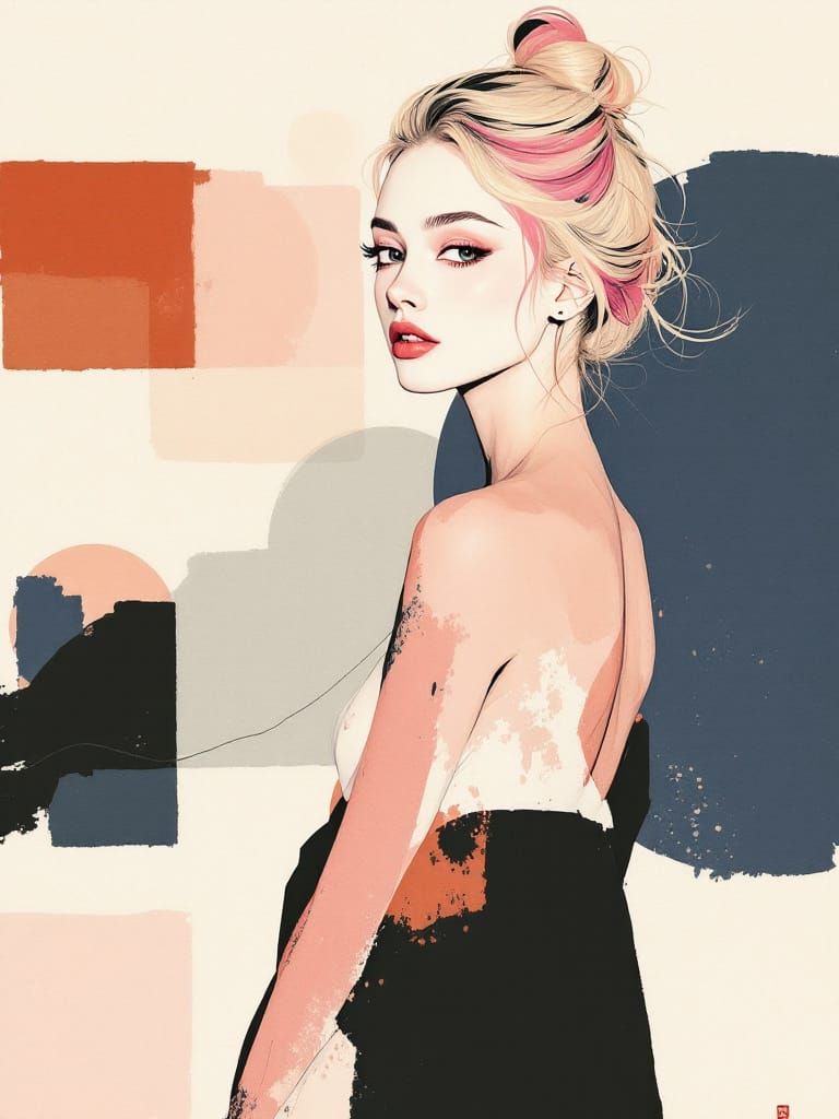 This image features a full-body portrait of a modern pin-up woman with pink-tipped hair, presented in a striking graphic style with flat color fields and bold ink outlines, inspired by Japanese art.