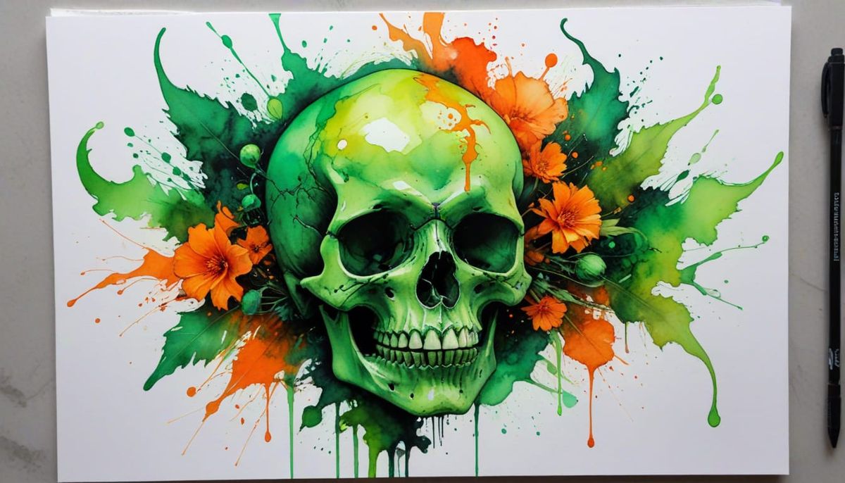 A vibrant neo-vanitas still life created with watercolor and alcohol ink. The piece features a striking neon green and orange color palette in a contemporary style.