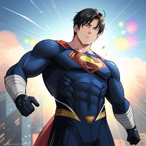 This image showcases a highly stylized, 3D anime art piece of Superman, depicted in a plastic blister pack with his parody gear displayed prominently. The scene is characterized by vibrant colors, dynamic lighting, and exaggerated features, blending humor and heroism in a unique, cinematic style.