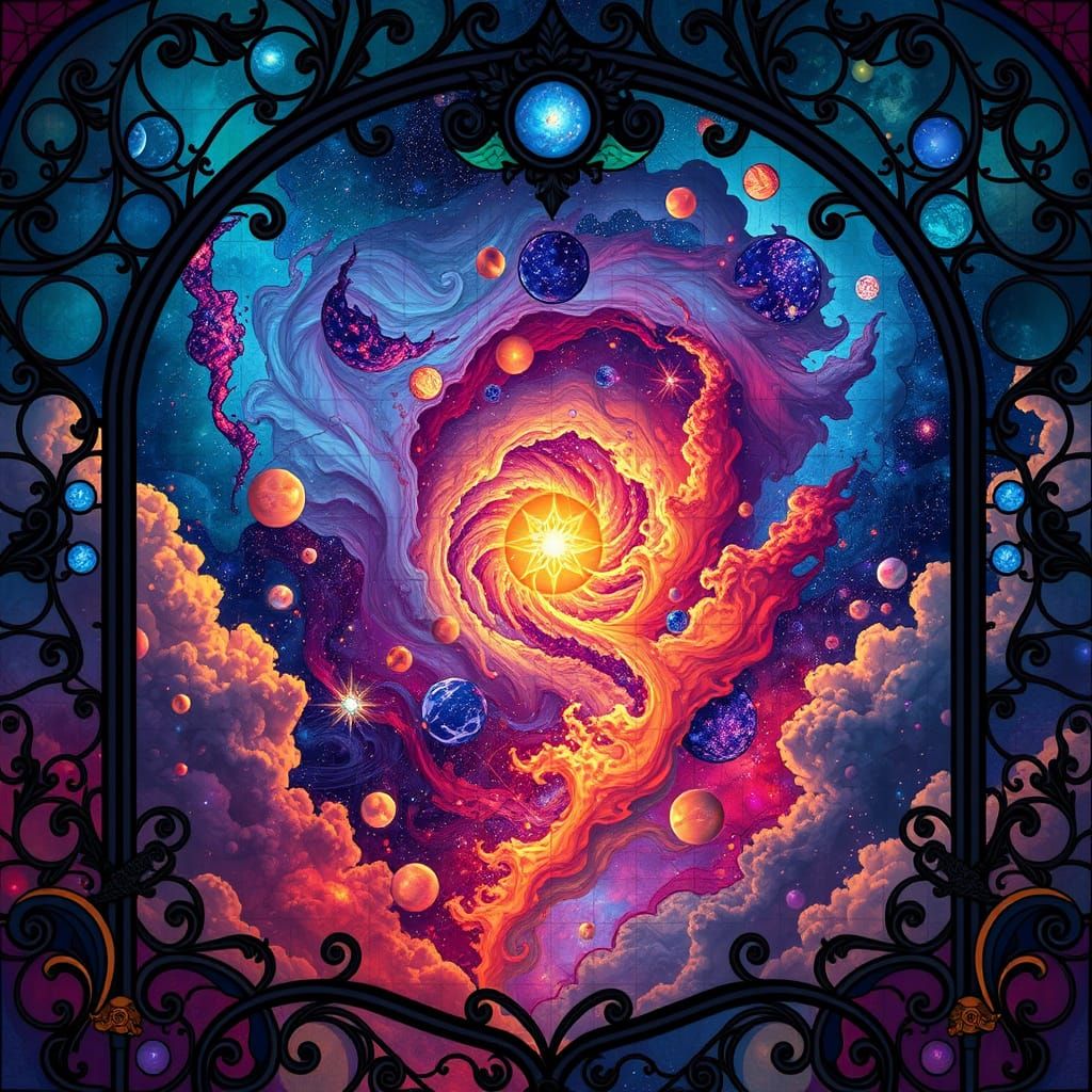 A breathtaking image of a galaxy featuring swirling clouds of color and light. The galaxy is framed by a stained glass grand design with Art Nouveau-style curvilinear lines and organic shapes.