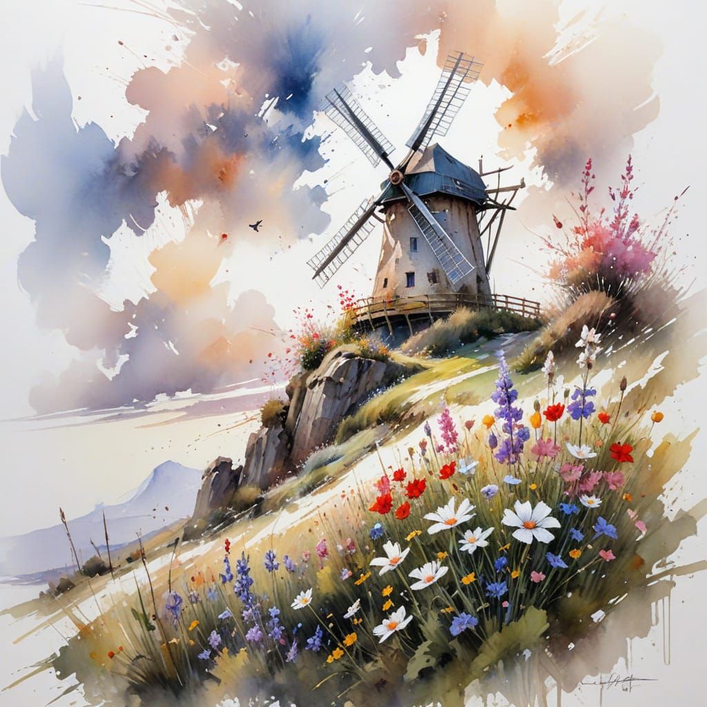 This image shows a charming windmill on a hill, surrounded by flowers. The artwork evokes a watercolour style, with expressive techniques and ethereal stylization, all harmoniously blended.
