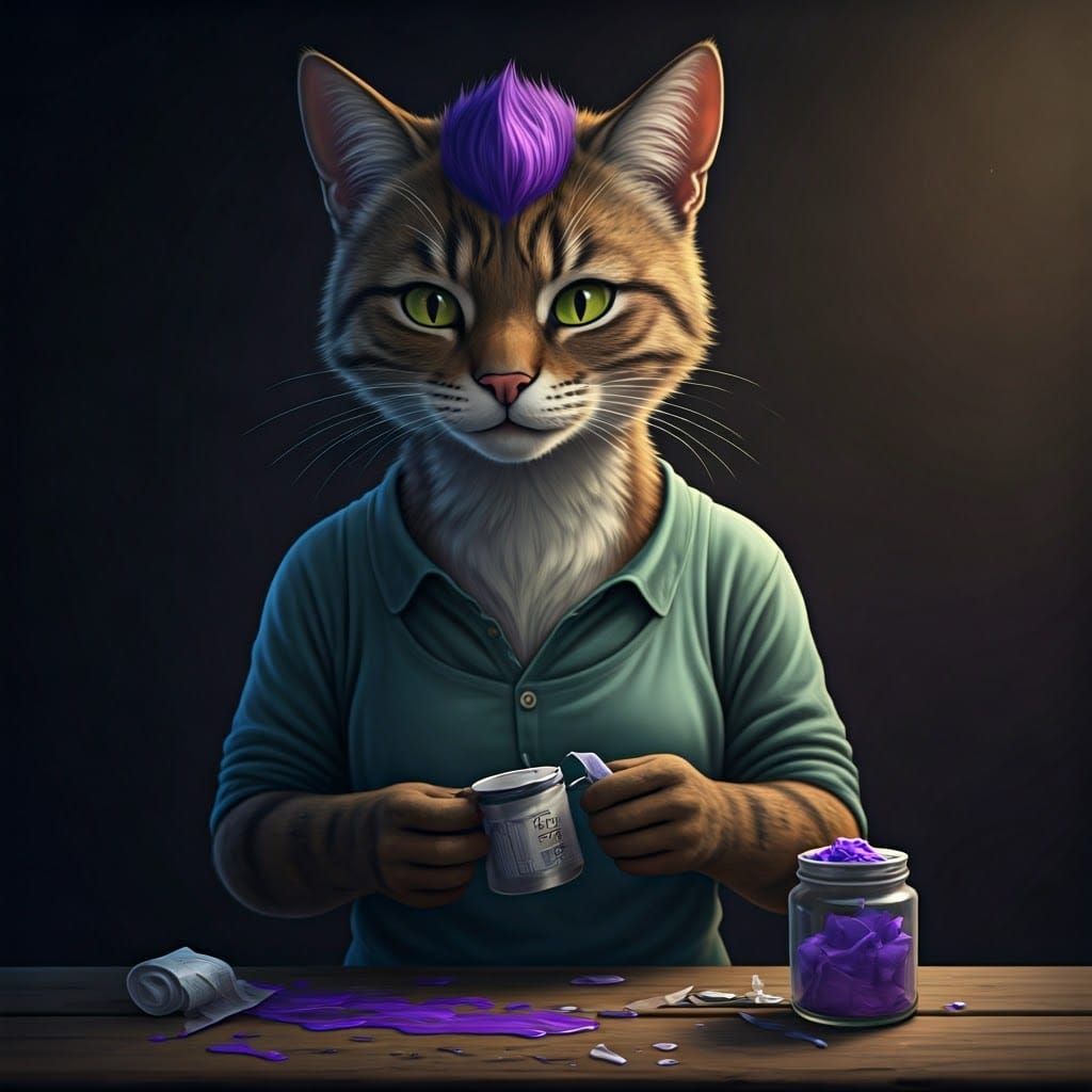This whimsical image shows a feline with a flair for fashion, dyeing her fur a vibrant purple hue. A creative take on animal self-expression, featuring a unique blend of human-like and feline characteristics.