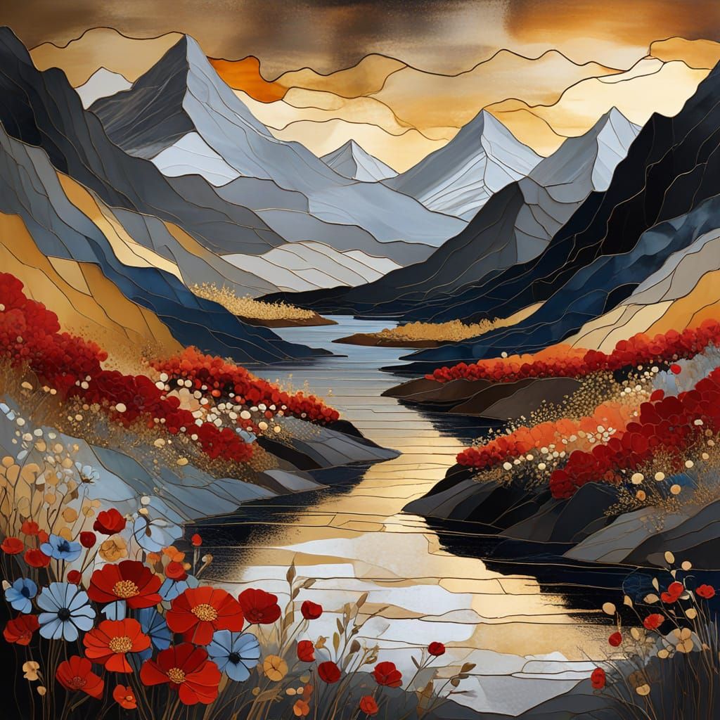 This image shows an abstract landscape featuring mountains and a lake at sunset. The artwork uses an art deco aesthetic with crumpled metallic and stained glass effects, rendered in dark oils with gold accents.