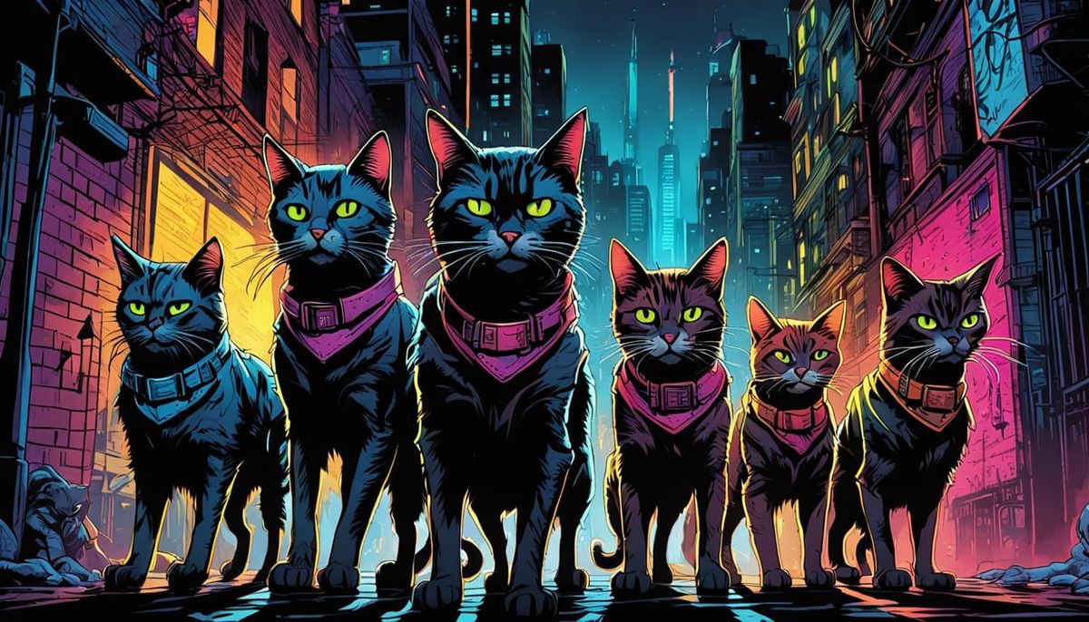A medium shot of stray cats in Gotham City, rendered in a gangstercore art style. The cats wear glowing neon collars and leather jackets amidst dark alleyway shadows and vibrant triadic colors.
