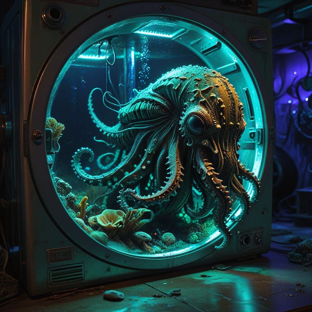 Imagine a bustling underwater jazz club thriving inside a vintage washing machine, teeming with marine life and vibrant coral formations. The washing machine, encrusted with barnacles and glowing algae, rests on the seabed, its porthole offering a glimpse into a lively scene. Fish of all colors groove to the music, while octopi serve drinks at the bar. Reminiscent of retrofuturism and bioluminescent art, with a touch of H.R. Giger's biomechanical aesthetics, creating a surreal and captivating image, with a color palette dominated by deep blues, greens, and vibrant corals, illuminated by the soft glow of underwater lights.