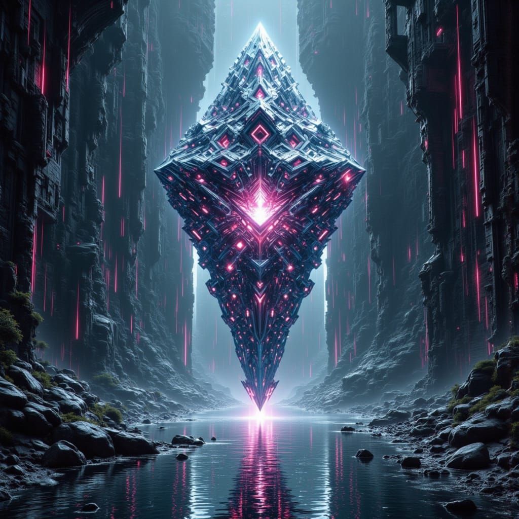 This image features a giant abstract geometric structure, possibly a colossal crystal, levitating and reflecting light. The artwork has a futuristic, cyberpunk aesthetic.